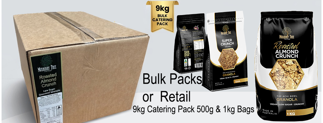 Roasted Almond Crunch Granola, is the acai bowl granola Australia's most popular for cafes, (low sugar, crunchy texture). We also offer Probiotic Paleo, Keto & Gluten Free Options available. RAC comes in Pack sizes from 500g retail window zip close bags to 1kg Bulk bags and 9kg Catering packs.